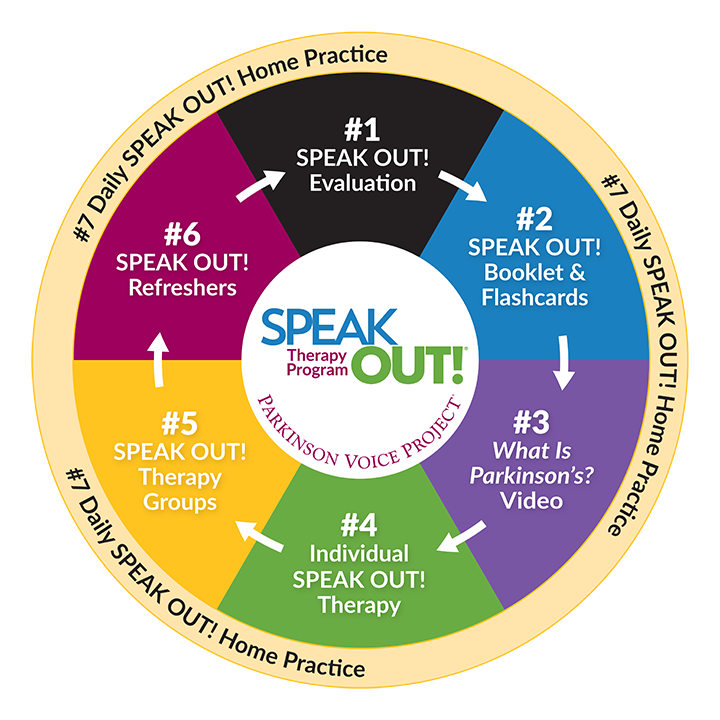 The SPEAK OUT! Therapy Program, developed by Parkinson Voice Project®, helps people with Parkinson’s disease and related disorders REGAIN and RETAIN their speech and swallowing. The program can improve volume, articulation, breath support for speech, vocal quality, intonation, and facial expression. Patients and families also report reduced drooling and improved swallowing. This highly effective, research-based treatment combines education, individual and group speech therapy, and daily home practice. The Circle of INTENT outlines the various therapy components and emphasizes that this program is lifelong.